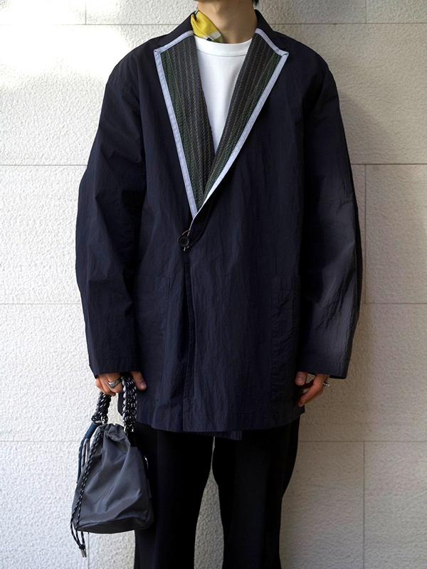 襟切り替えのナイロンジャケットが主役のコーディネート。ナイロンのスポーティさとジャケットのキレイ目な雰囲気に合わせ、革靴やナイロンバッグなど他の合わせるアイテムもミックステイストに仕上げています。