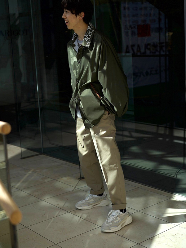 続いては襟ロゴが新しさ全開のナイロンブルゾンのスタイリング。カーキやベージュ、ライトグレーでまとめて爽やかなスプリングスタイルに。