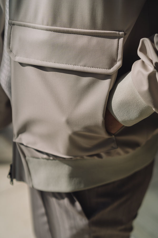 こちらのジャケットは、イタリアの高級生地メーカー「ロロピアーナ」のコレクションでヴァージンウール100%使用したストームシステムという生地を採用しており、防風、撥水性を兼ね備えております。