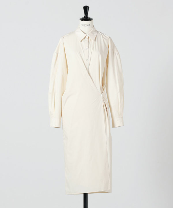 LEMAIRE(ルメール)のドレス。 「STRAIGHT COLLAR TWISTED DRESS」はブランドの定番アイテムです。ストレートカラーと、ヒップで閉じ、ウエストから膝下まで体を包み込む非対称のボタンプラケットが特徴です。