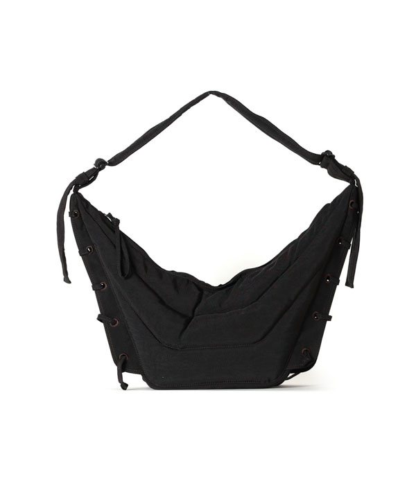 LEMAIRE(ルメール)のナイロンキャンバスショルダーバッグ。「ソフトゲーム」シリーズの最大のサイズです。撥水加工が施された、ややふわふわしたナイロンキャンバス製で、GRS認証を受けています。詰め物入りの生地が、マットな表面と、長期間形状を維持する丈夫な構造をバッグにもたらします。クロワッサンバッグからインスピレーションを得たラージソフトゲームは、パッド入りの調節可能なストラップと内側のジッパー付きポケットにより、軽量でありながら機能的です。
