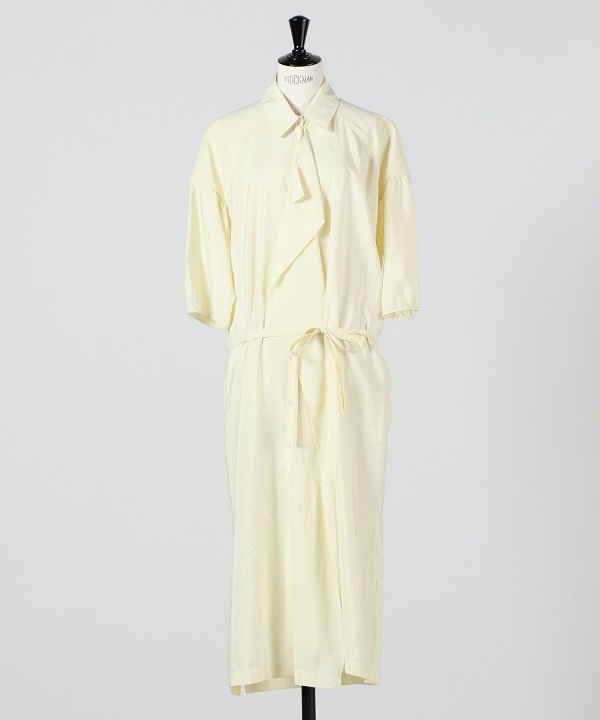 LEMAIRE(ルメール)のドレス。エレガントでありながら、シルエットにこだわったモダンな一着。LEMAIREのアイコニックなスタイルを新たな解釈で表現したデザインです。ワイドカットのゆったりとしたシルエットが特徴で、肩を落としたドロップショルダーと、軽くギャザーを寄せたスリーブが女性らしい柔らかな印象を与えます。フロントのアシンメトリーなフラップとコントラストの効いたボックスプリーツが動きを生み、洗練された印象に。付属の同素材のベルトでウエストを絞れば、メリハリのあるシルエットも楽しめます。マザーオブパールのボタンが上品なアクセントに。3/4丈の袖は、手元を美しく見せる計算されたデザインです。