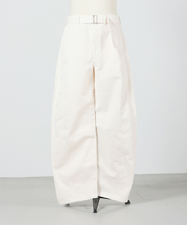 LEMAIRE(ルメール)のデニムパンツ。 ルメールのアイコニックなツイステッドパンツを再解釈したユニセックス仕様の一本。サイドシームにわずかなねじりを加えることで、レッグラインに独特のカーブを生み出し、立体的で洗練されたシルエットを演出します。ミッドライズのウエストには、メタルバックル付きの取り外し可能なベルトを備え、フィット感を調整可能。レギュラーフィットながら、長めの丈感がモードな雰囲気を醸し出します。サイドポケットとバックパッチポケットを配置し、コントラストステッチがアクセントに。シンプルながらもデザイン性の高い、タイムレスな一本です。