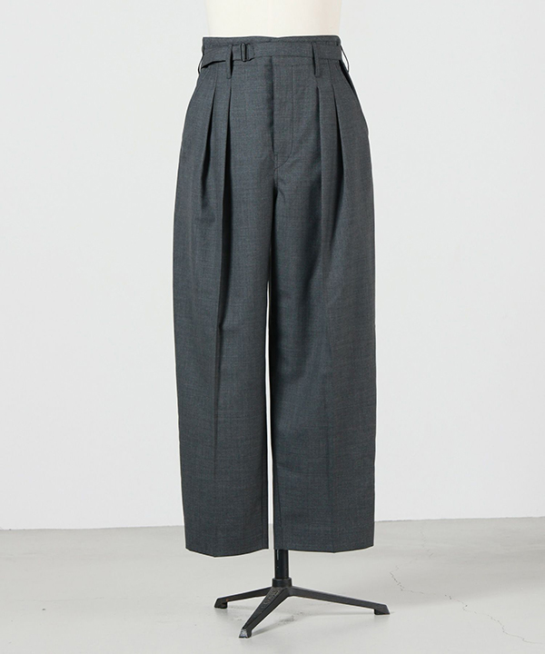 LEMAIRE(ルメール)のパンツ。 リラックス感のあるキャロットフィットに、4本のフロントプリーツが立体的なシルエットを演出。 ウエスト部分には共布ベルトとメタルバックルが施され、トップエッジのトリミングが繊細なアクセントに。 フロントには斜めのサイドポケットを2つ、バックにはジェットポケットを備え、実用性と美しさを兼ね備えたデザインです。 軽やかながらも密度のあるツイル素材を使用し、カジュアルからフォーマルまで幅広いスタイリングが可能です。