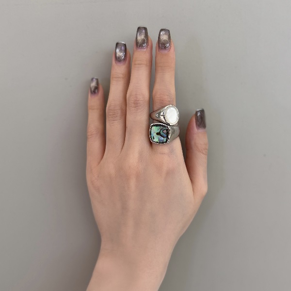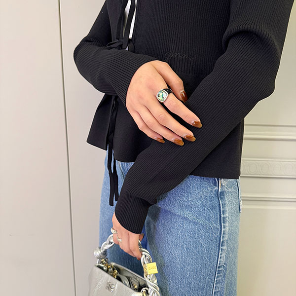 デニム合わせのカジュアルスタイルに『アバロンシェル』の表情感がアクセントになってくれます。リボン付きの甘めカーディガンにも相性抜群です。こちらのリングを付けるだけでどんなコーディネートもすっきり大人な印象に変化をもたらしてくれる、まさに魔法のリングです!