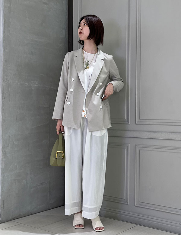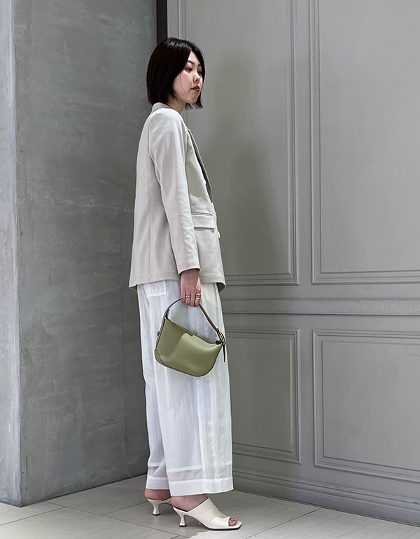 ベージュやホワイトのワントーンコーディネートにぴったり馴染んでくれます。