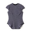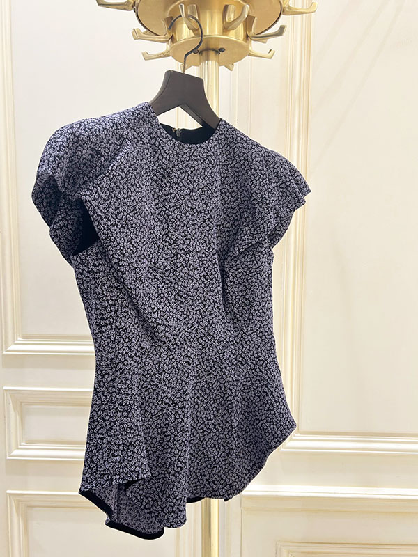 『Cording Embroidery Quilted Wrapped Skirt』のネイビーと、『Micro Floral Jacquard Top』のパープルです。