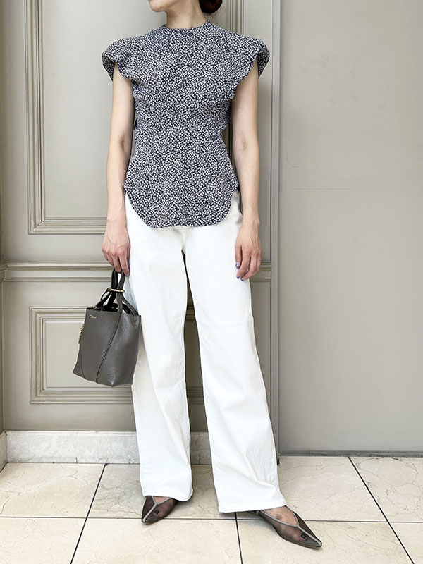 ラベンダーはベースがブラック、色違いのこちらのホワイトはネイビーベースです。クリーンなホワイトデニムに合わせてキレイめカジュアルスタイルが完成。