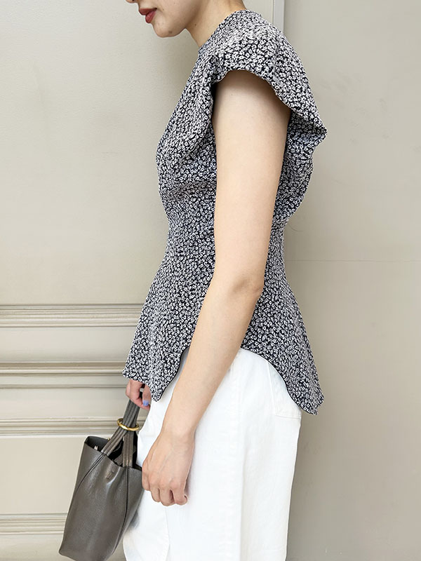 立体的なパターンながらも伸縮性があり日常使いにピッタリな小花柄トップスです。私物の春カラーのレースインナーをレイヤードしボリュームスカートを合わせロマンチックなスタイルも気分!