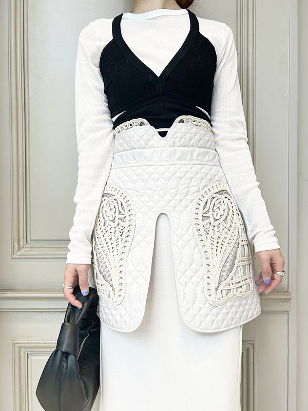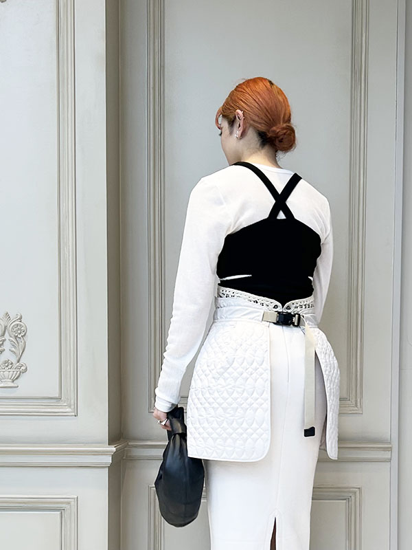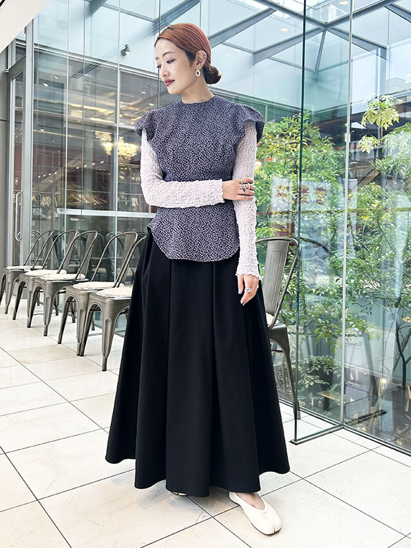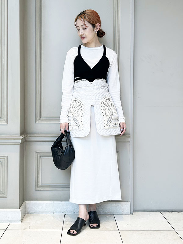 色違いのエクリュでまた違った雰囲気に仕上げました。コード刺繍シリーズのスウェットスカートにレイヤードすることで女っぽくもカジュアルかつモードなスタイリングに。キリッとバランス良くブラックを取り入れるのがポイントです!
