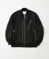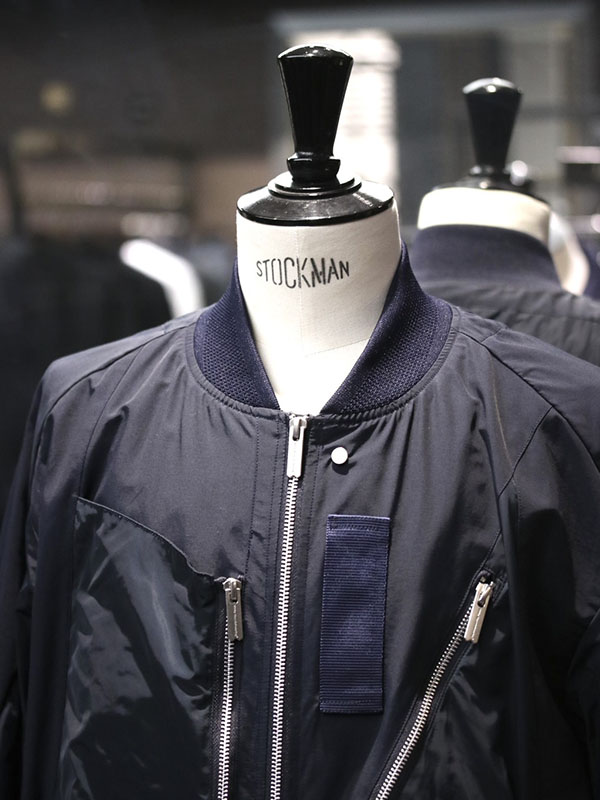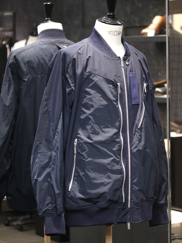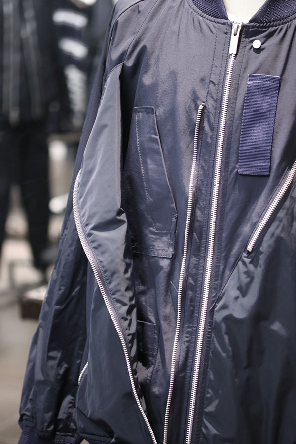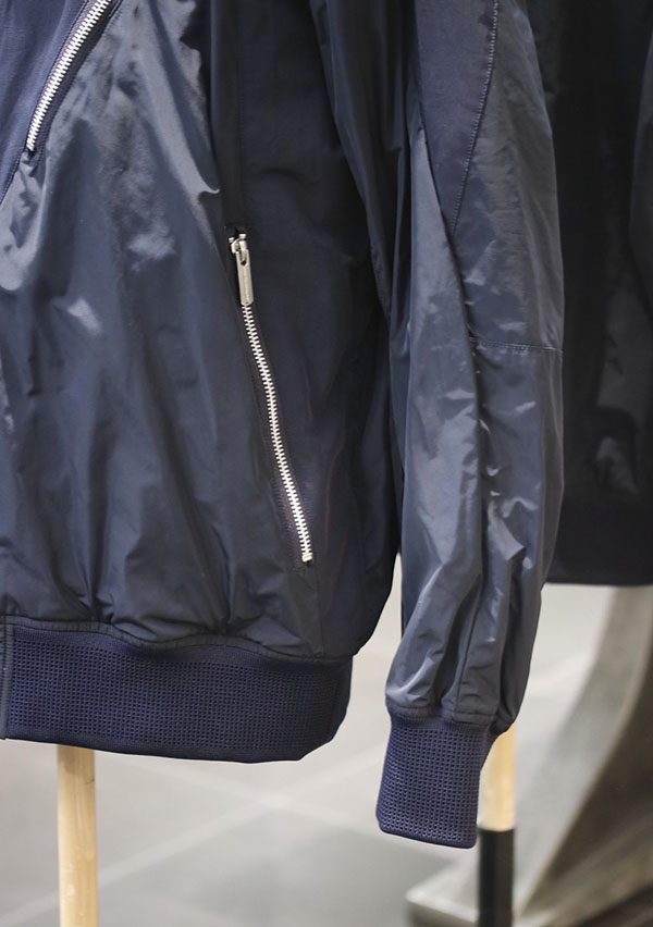 こちらはファスナーポケットを左右非対称に配置したデザインが特徴なフライトジャケット。程よいハリ感と上質な光沢感のある高密度なポリエステル素材を使用しています。