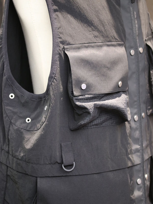 こちらは前面にマチのあるパッチポケットを配置したラゲッジベスト。もう少し暖かくなってくるとカットソー1枚でスタイリングが単調になってしまうこともあるかと思いますが、このようなベストを1枚羽織るだけで立体感のあるスタイリングに仕上がります。コートのインナーなどでもお使いいただけますし、夏はTシャツの上からも着られるのでオールシーズン使って頂けます。