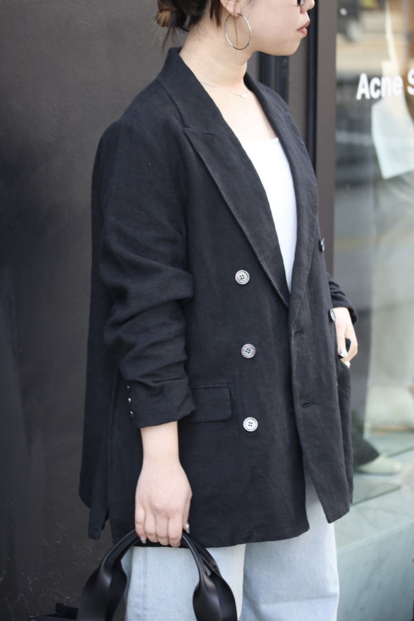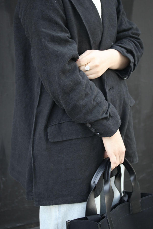 ジャケットは、春夏には嬉しいリネン素材なので、ラフに羽織っていただけます。パンツにはもちろんですが、ワンピースやスカートと合わせても、全体的にまとまりを出してくれるので着回し力も抜群です◎