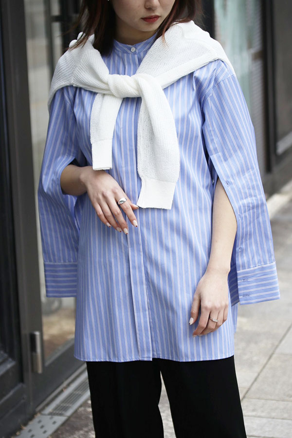 アーム部分にはボタンがついていて、外すとケープ風になるデザインシャツで楽しめることもできるんです。インナーにシアートップスなどと合わせても◎