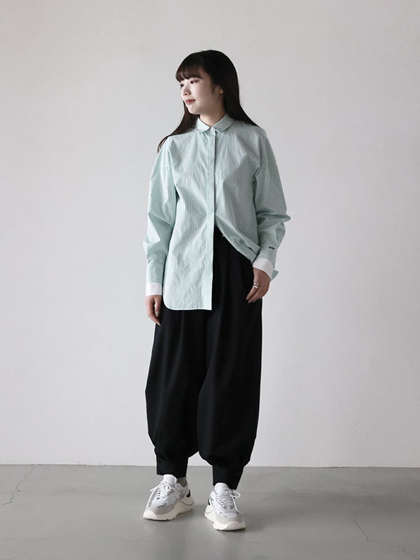 レイヤードにも使える大きすぎない身幅でベーシックなシャツです。 袖口のレイヤードカフスがスタイリングのアクセントになります。 背中の袖まで続く大胆なデザインがポイントです。