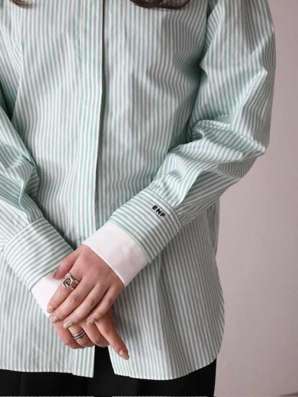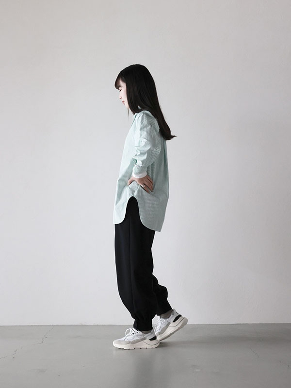 オススメポイントは、一見定番になりつつあるストライプ柄シャツもトレンドのミントグリーンを使うことによって、より爽やかなコーディネートが叶うところです。前開きなので羽織