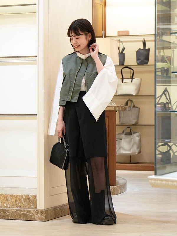 シアー感のある素材との異素材ミックスがオシャレ度をアップしてくれます。