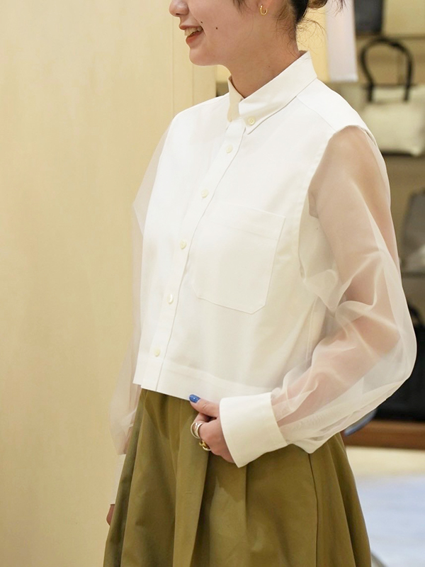 こちらはクロップド丈でのシアーシャツ。先ほどよりもシアー感があるスリーブデザインが特徴的です。