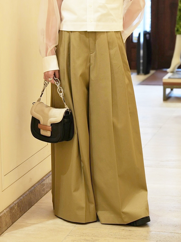 Aラインシルエットのパンツと合わせてメリハリを効かせたフェミニンさのあるスタイリングがオススメです♪