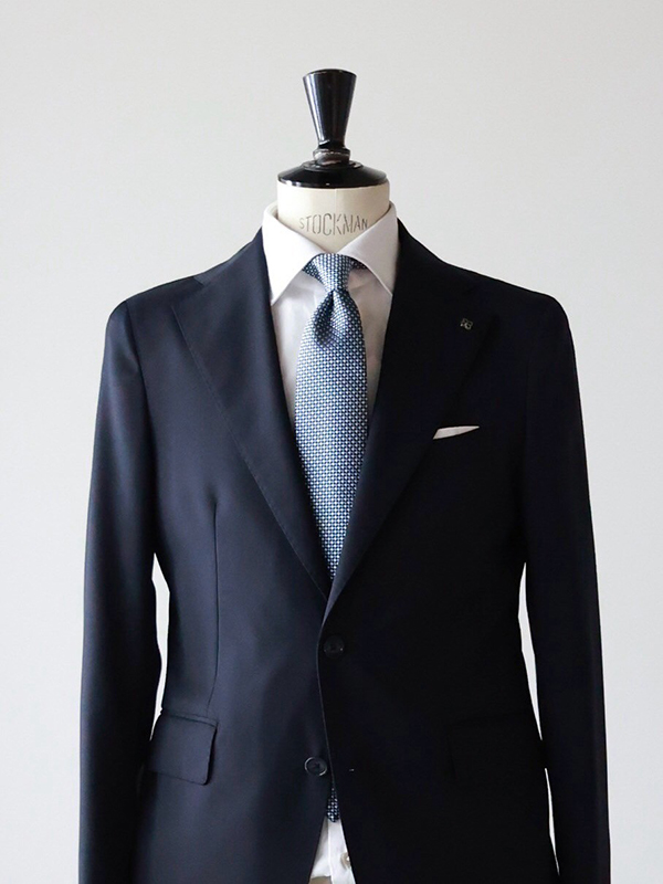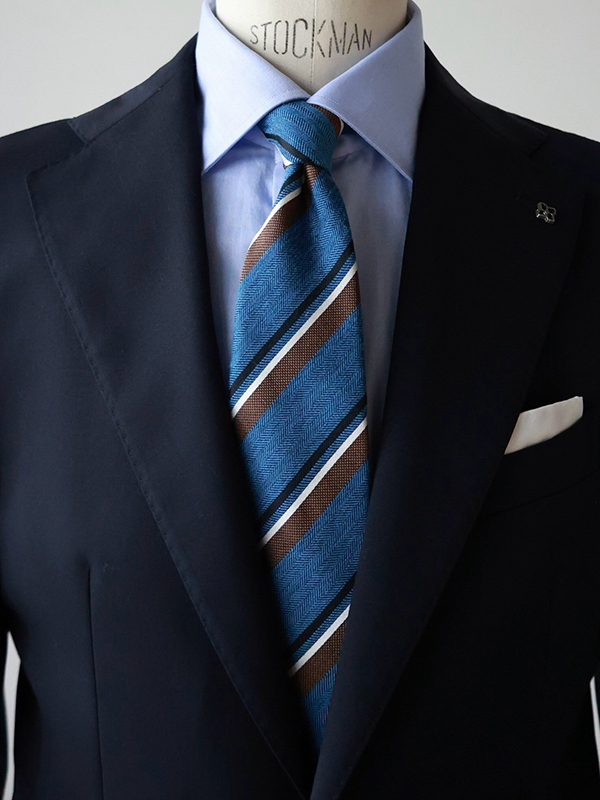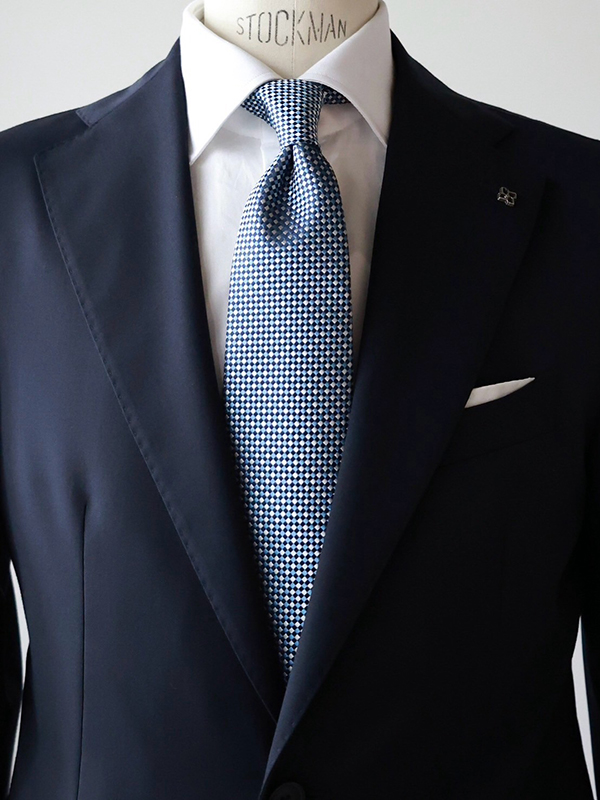 こちらのネクタイはブルー、ネイビー、ホワイトの色で構成されているので、ジャケットとシャツの色が両方入っています。このようなネクタイはオーソドックスで華やかさには欠けるかもしれませんが、色だけで言うとかなり合わせやすい一本です。