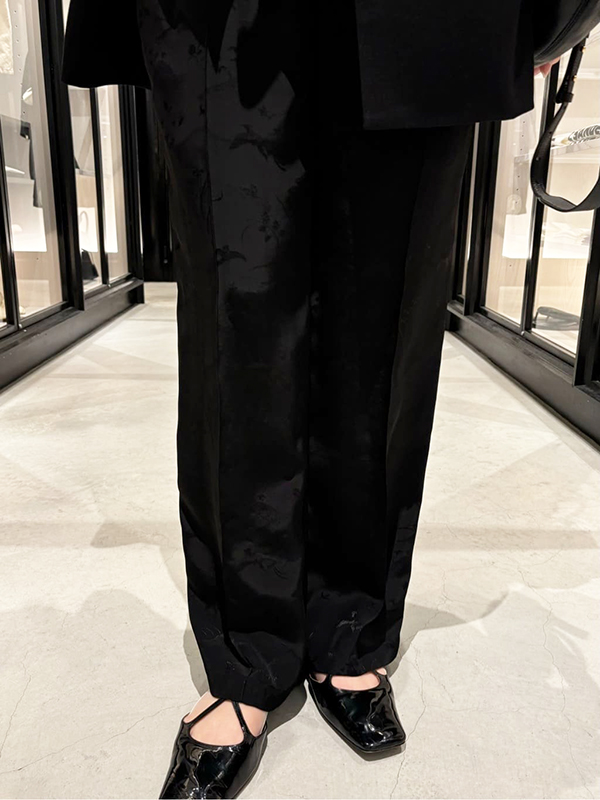 私のマイベストマメは「Viscose Rayon Floral Jacquard Trousers」です!しなやかに浮かび上がる刺繍の上品さに衝撃を受けました!琉球漆器の螺鈿模様や沖縄の伝統染め「便型」にインスパイアされた花鳥柄が特徴的なジャガードがマメらしさを引き立てます。リラックスさと上品さも欲しい欲張りな私には釘付けの一着です!