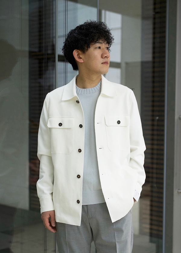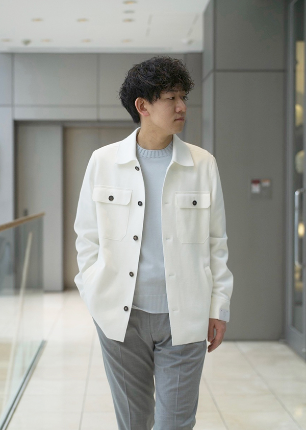 季節感は白を基調とした明るさと、さり気なくインナーに入れたとても淡いサックスブルーに見えるライトグレーのサマーニットが春らしさを演出します。