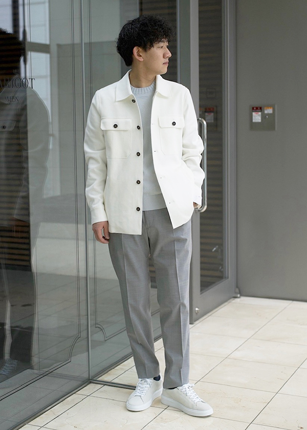 統一感は、羽織を白にしたので足元も白にして上下を白、インナーの色をパンツと近い色味で合わせることで全体的に色のばらつきを抑えまとまって見えるようにしております。