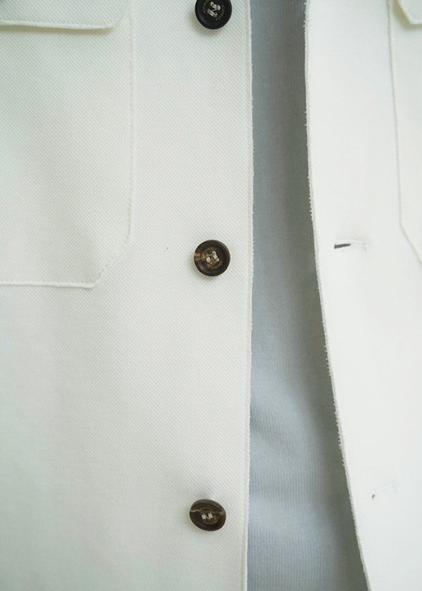 ボタンも濃いブラウンの色味が白とのコントラストを余計に際立ててくれており、このような細かいディテールにブランドのこだわりを感じますね。