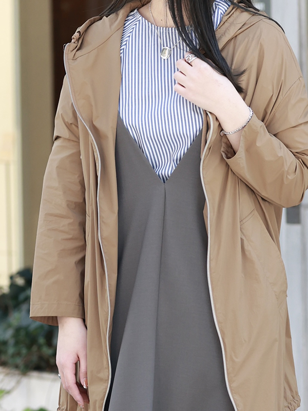 写真のように軽い春アウターを羽織ったり、インナーを工夫したりすることで長く着用できる優れものです。