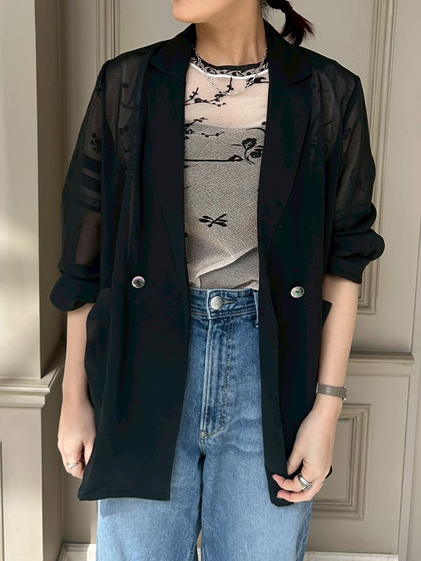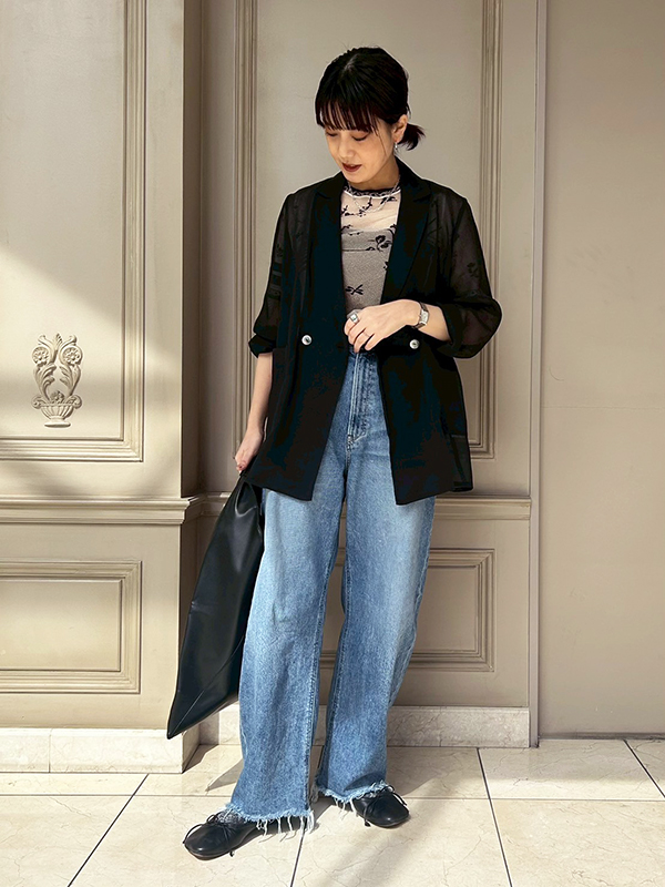 トップスはオーダーしていたMame Kurogouchi(マメクロゴウチ)のキラキラカットソーに、最近購入しヘビロテで着ている透け感のあるオーガンジージャケットを。このジャケット、①洗える②シワにならない③きちんと感がある。機能面を服にも求める私にとってぴったりのアイテムなんです!