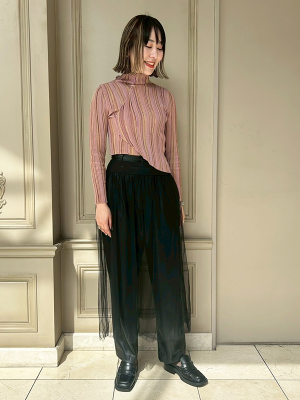 レザーパンツにHYKE(ハイク)のシースルーアイテムを合わせて、少しモードな雰囲気に仕上げています!