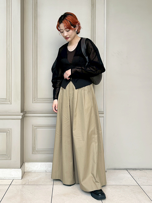 上下とも今シーズンにオーダーしていたアイテムでコーディネート。HYKE(ハイク)のスーパーワイドパンツは広島店スタッフ内でも大人気のかぶりまくりアイテムです!