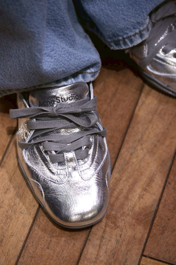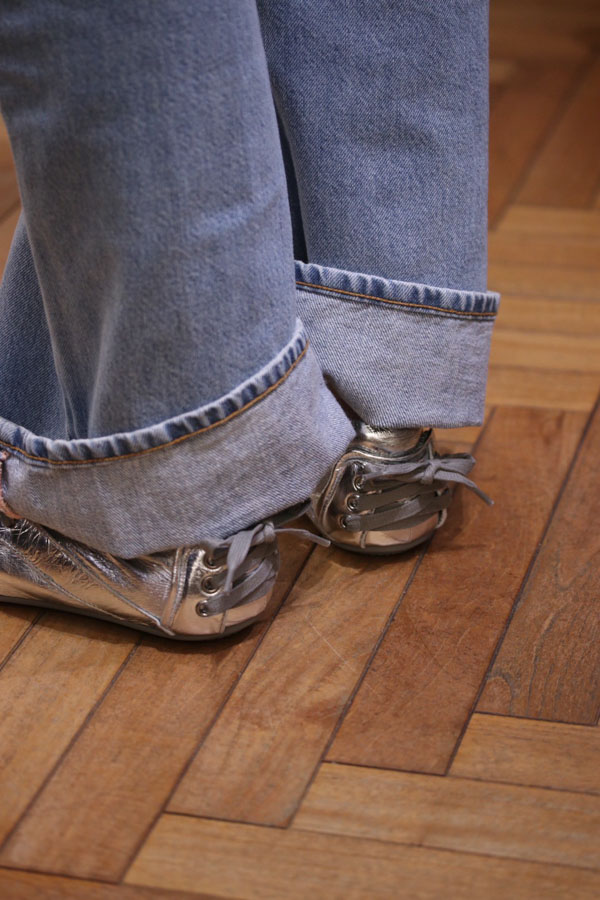 足元はバレリーナシューズのシルエットを再解釈したシルバーのレースアップシューズをオン!