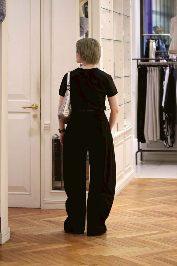 オールブラックにバッグとベルトでシルバーを加えてポイントにしています。