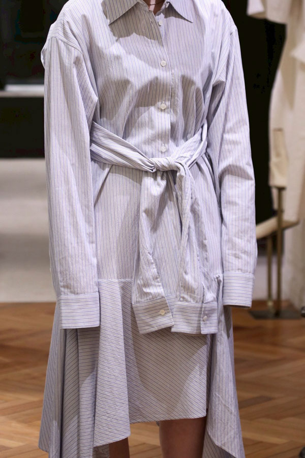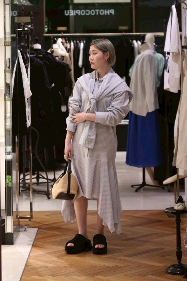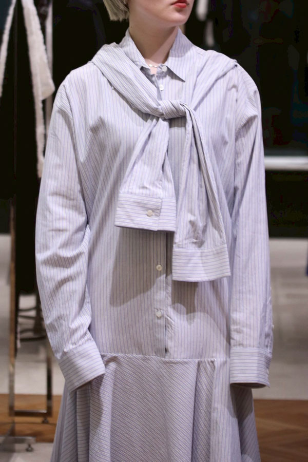 肩のタイアップスリーブスカーフをアレンジして、1枚でレイヤードスタイルが完成するシャツドレス。