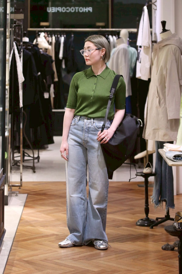 ルーズフィットなシルエットのデニムにコンパクトなポロシャツを合わせました。