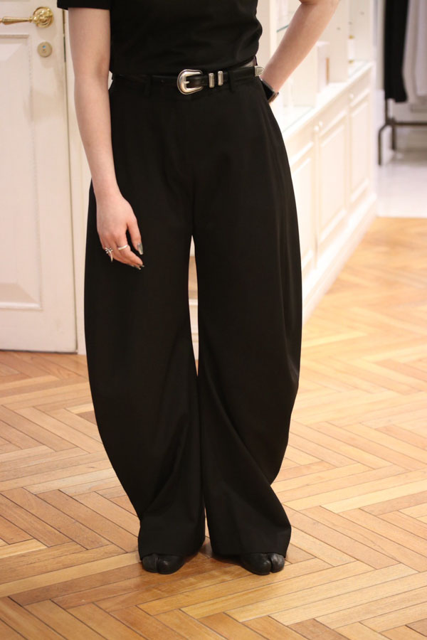 コンパクトなTシャツにはたっぷりワイドが気分!ということで、合わせたのはカーブシルエットのトラウザーズ。