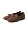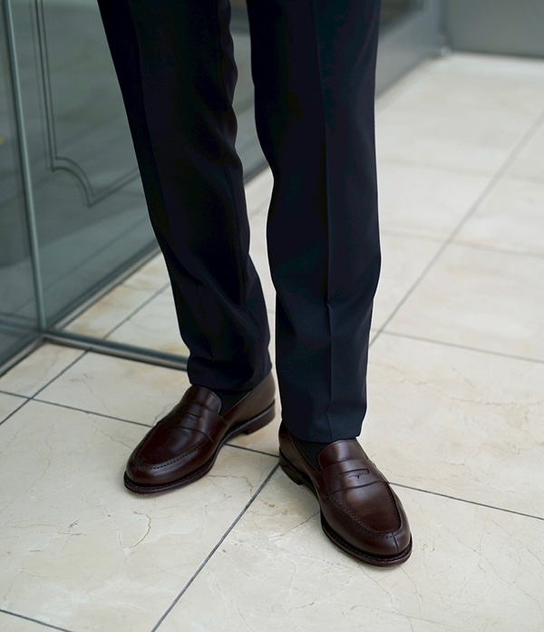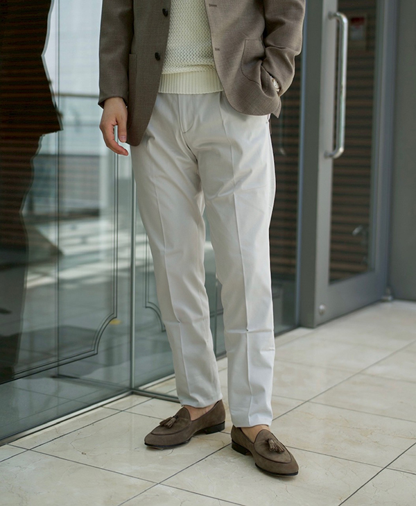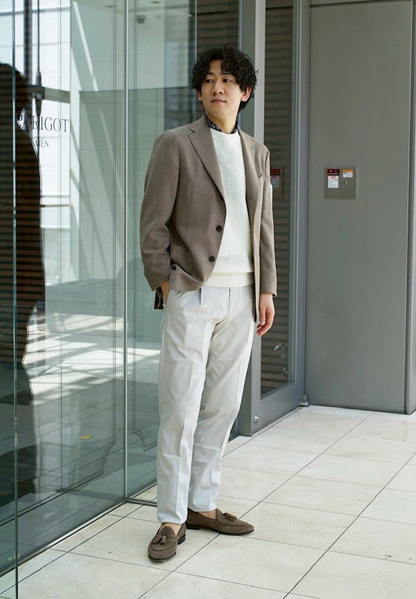 パンツもややゆとりのあるシルエットと、靴はスウェードのタッセルで併せてリラックス感と品の良さを演出。
