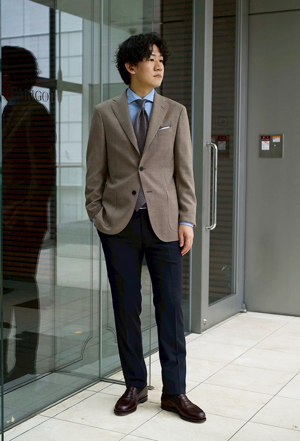 「オン」の時はブラウンの色味を渋く見せないよう、シャツはサックスブルーでパンツはダークネイビー、足元は少し濃いめのブラウンローファーで色合わせをしております。