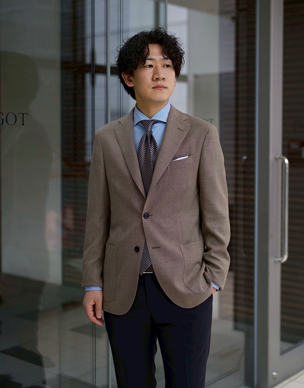 ネクタイも色をブラウンとネイビーを拾って全体との色味の統一感を出すこともお忘れずに。