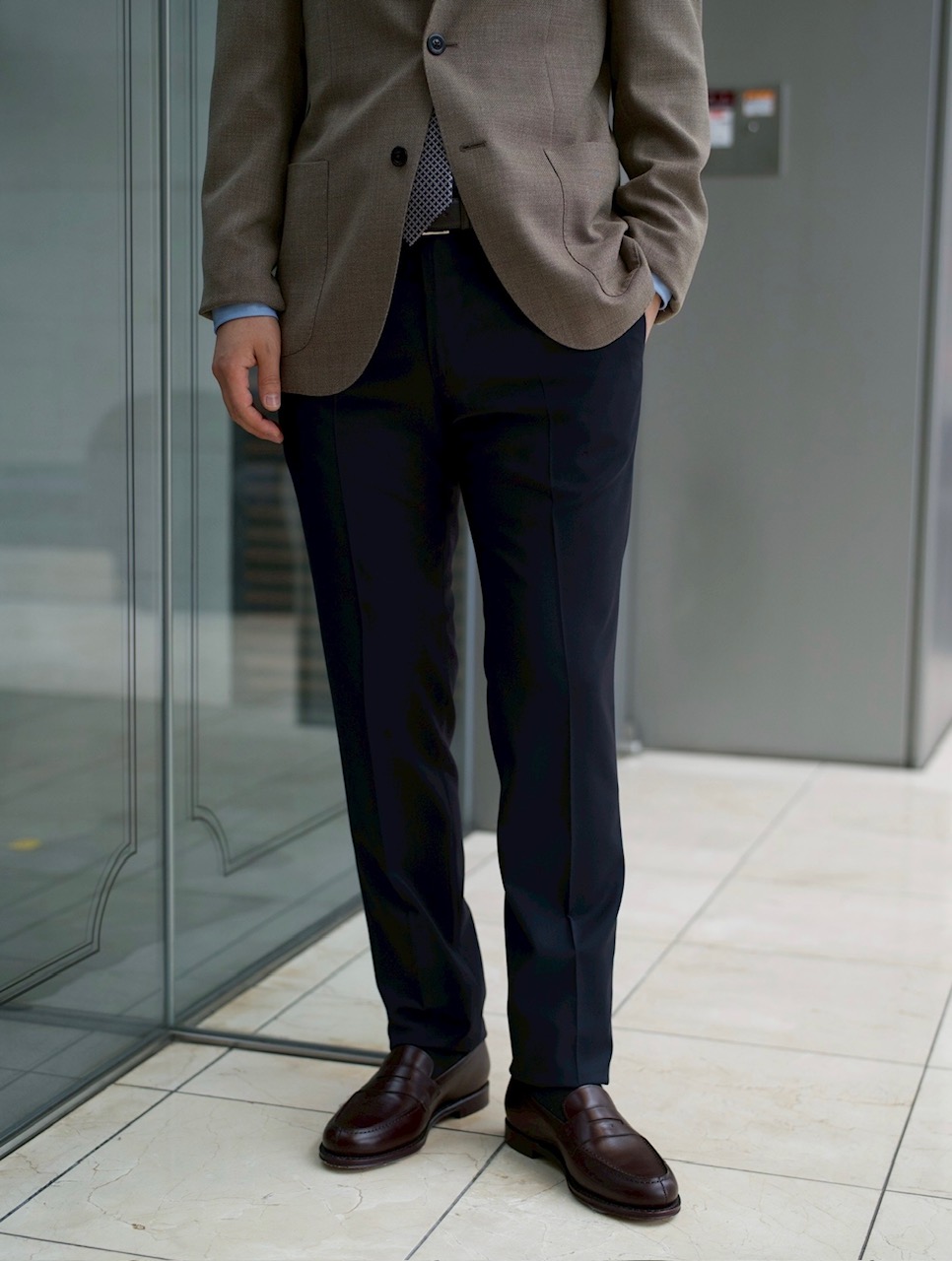 パンツはダークネイビーを使うことでシャツとの色味の統一をしながらも、全体を引き締める色の役割をしております。