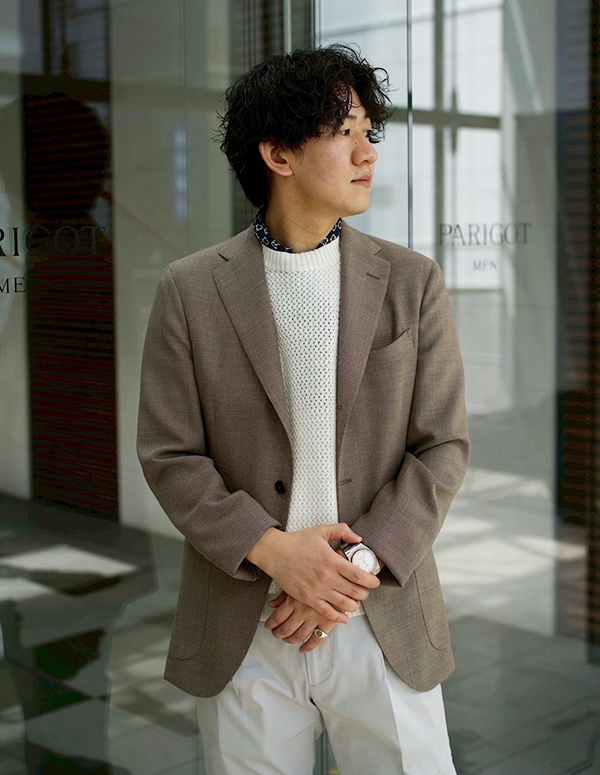 インナーも今季トレンドのメッシュニットを使用してジャケットを脱いでも折柄が印象的で一枚でも様になります。
