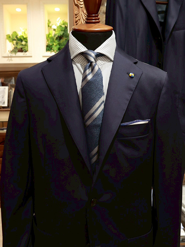 特にスーツは無地で、シャツがストライプという場合が多いと思うので、そちらでコーディネートしました。