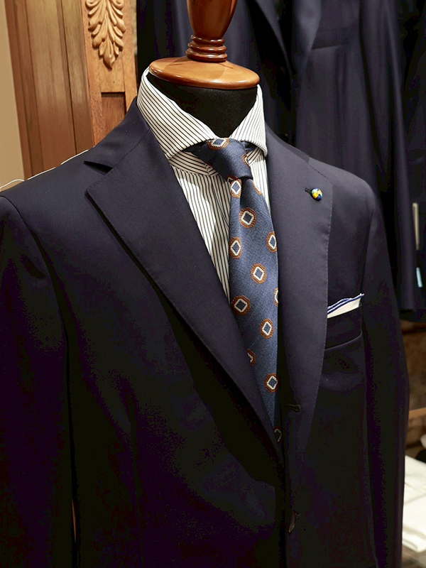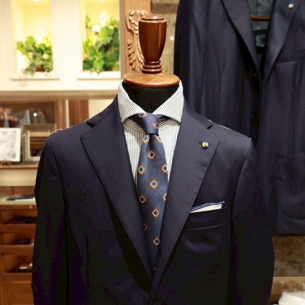 こちらも無地のネタクイで合わせるなら、濃紺のソリッドタイがベストマッチだと思いますが、柄物のジャケットに対しても柄のネクタイを合わすことが出来るので、ジャケパンスタイルが多い方は、お手持ちのネクタイの柄がジャケットの柄に対して、合うかどうか試してみて下さい(^^)