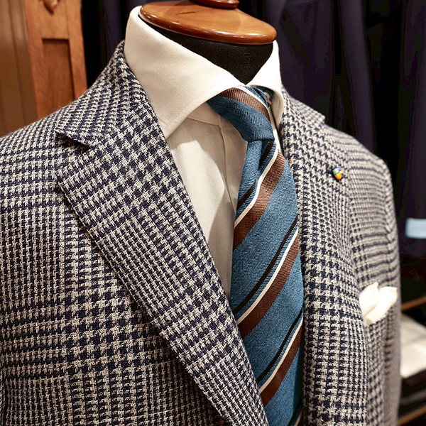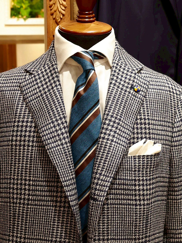 千鳥柄のグレンチェックジャケットで柄は中くらいの大きさに対して、合わせたネクタイのストライプ幅は広いものを合わせています。