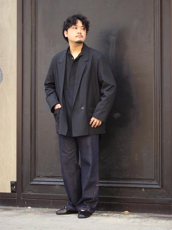 「今回のスタイリングのベースはジャケットとデニムのジャケパンスタイルなのですが、シルエットやディティール等、細かいところに気を配っています。