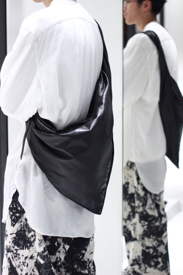 トップステッチの繋ぎ目をあえて見せるカットアウトの組み合わせ、共生地のショルダーストラップを結びあげた、やや「和」を感じさせるデザインは、日本人の肌に合うエッセンスです。