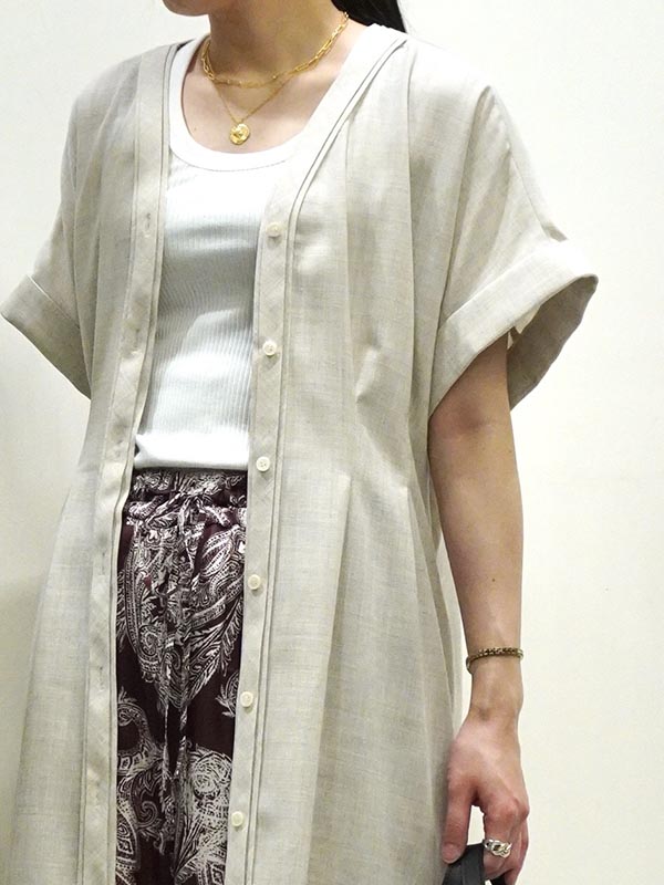 カラーは柔らかく上品なベージュ。肌なじみがよく、落ち着いた印象なので、ラフに着てもカチッと大人っぽく着てもハマる一着です。