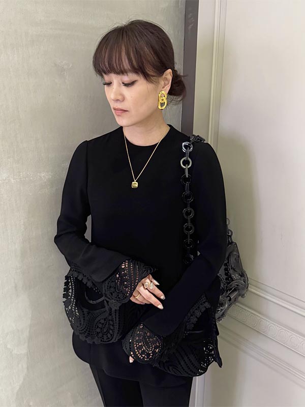 小物はBLACKに映えるシルバーやクリアのアイテムとあわせて、手元にはCharlotte Chesnais(シャルロットシェネ)の大ぶりなブレスレットをポイントに。