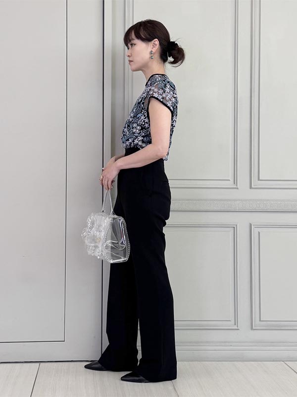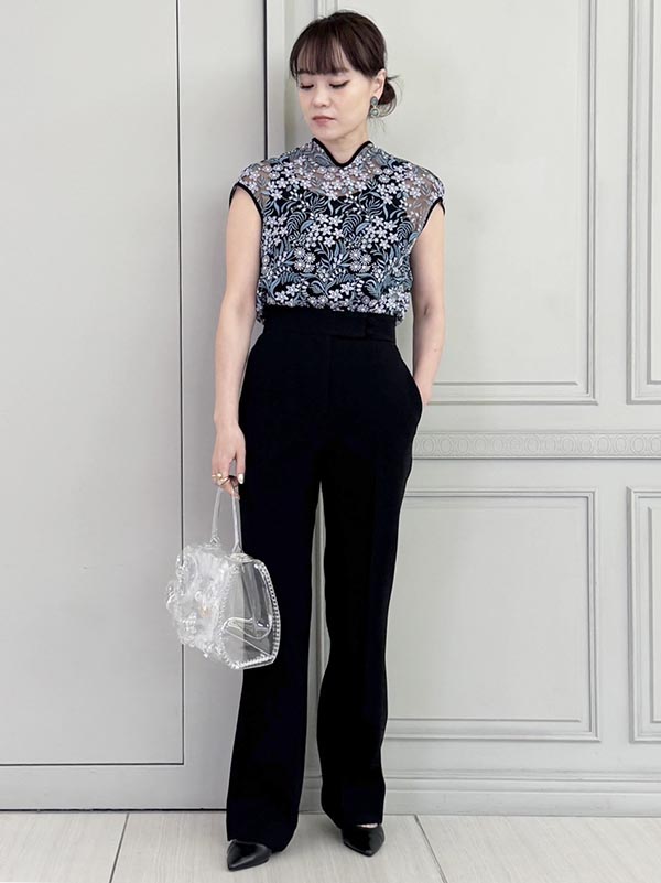 今季仕様にアップデートされた繊細な刺繍が全体に施され、華やかで涼やかな印象を演出したトップス。
